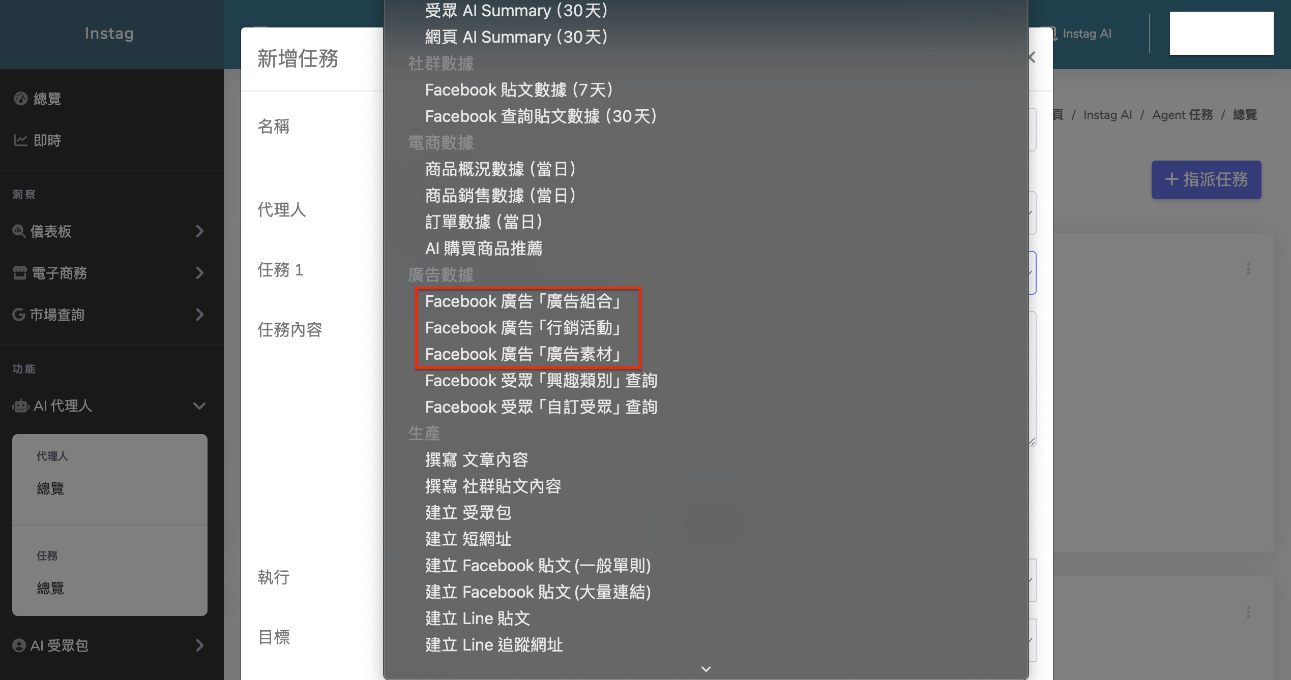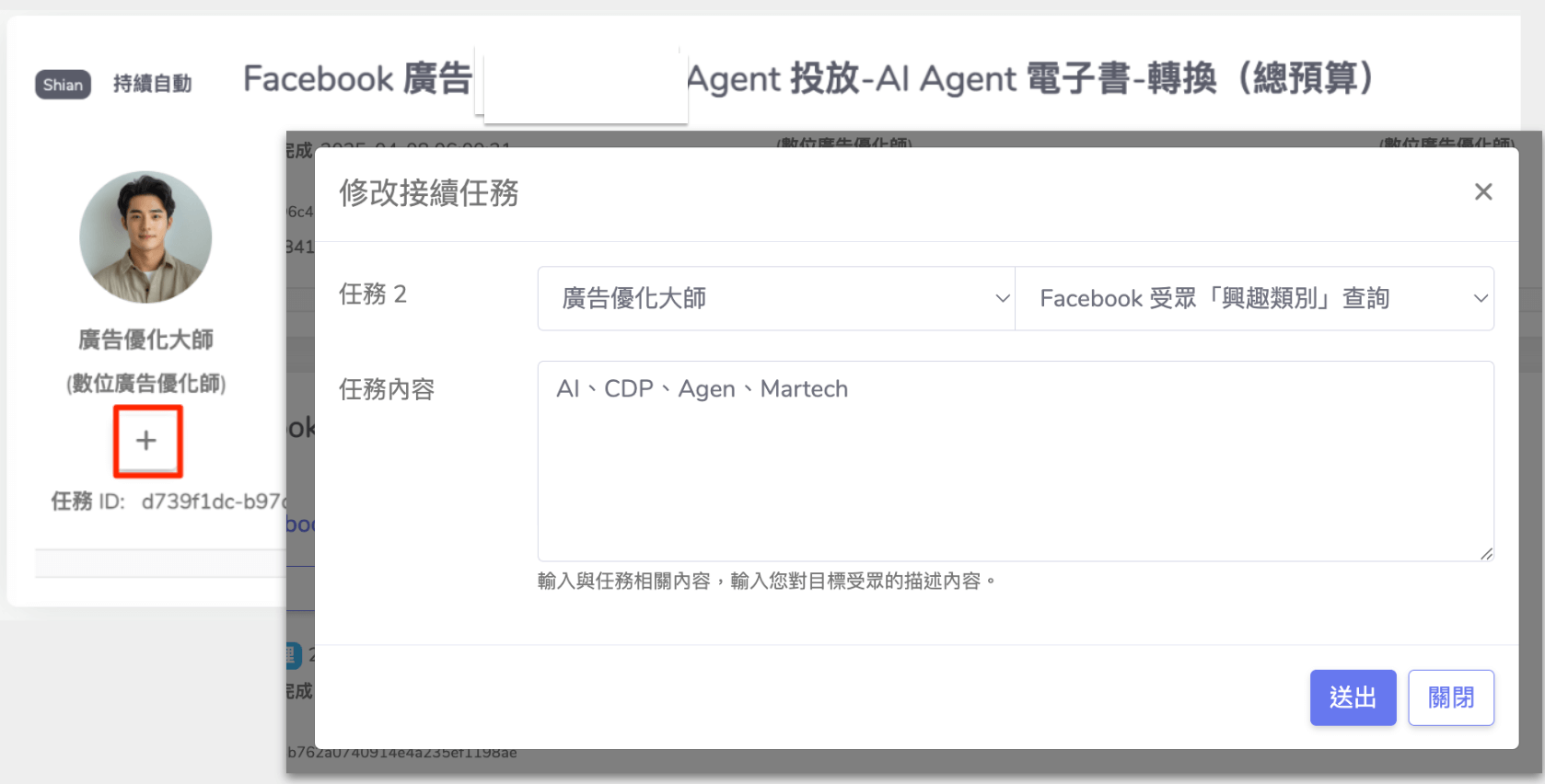 - 任務內容:目標受眾描述(此任務代表你要 Agent 去增生哪種受眾的類型,比如你可以寫:女裝、美妝、流行 等)