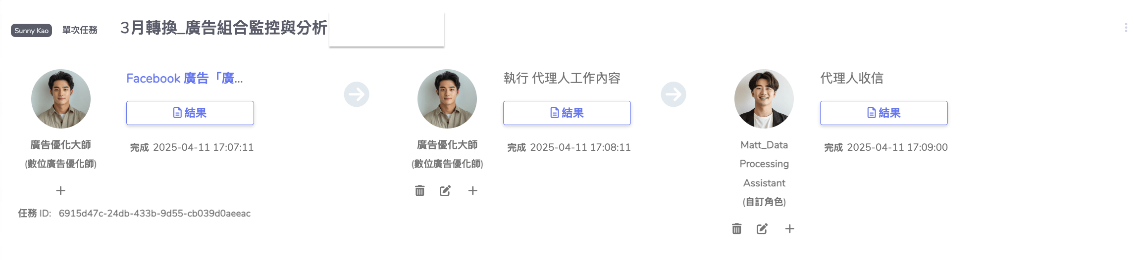 這些角色將作為後續工作流的執行者,包含:監控廣告數據、裂變廣告組合、暫停低效素材等任務。