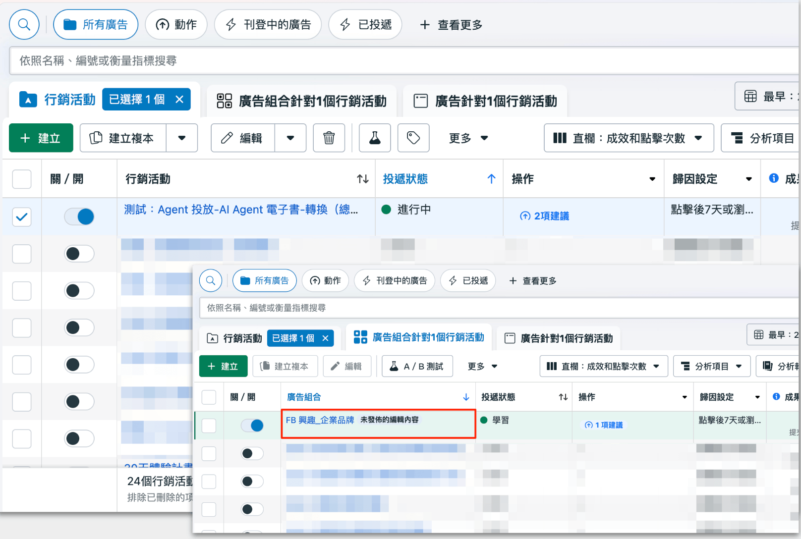 接著可至廣告後台,查看先前預設好的廣告組合,幾秒鐘可重整一次,即會看到由 Agent 所增生出來的廣告組合及廣告。